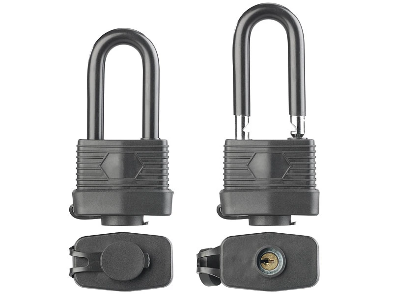 Ideal für den Außeneinsatz: Die Schlösser sind vollständig mit PVC-Kunststoff ummantelt. Das schützt sie effektiv vor Witterungseinflüssen. Zudem verhindert die Ummantelung, dass sie die soliden Metall-Gehäuse z.B. bei Wind Ihre Schuppentür verkratzen.