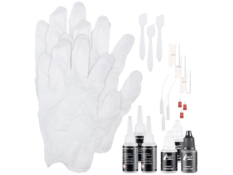 - 3er-Set Sekundenkleber inklusive 3 Granulate, 3 Handschuhe, 3 Spachtel, 3 Nadeln, 3 Applikatoren und deutscher Anleitung – Secundenkleber – Außerdem relevant oder passend zu: das, Blitz, selbst, Flasche, Keramik, Modellbau, reparieren, Schweißnaht, LED Flaschen, Reparaturset