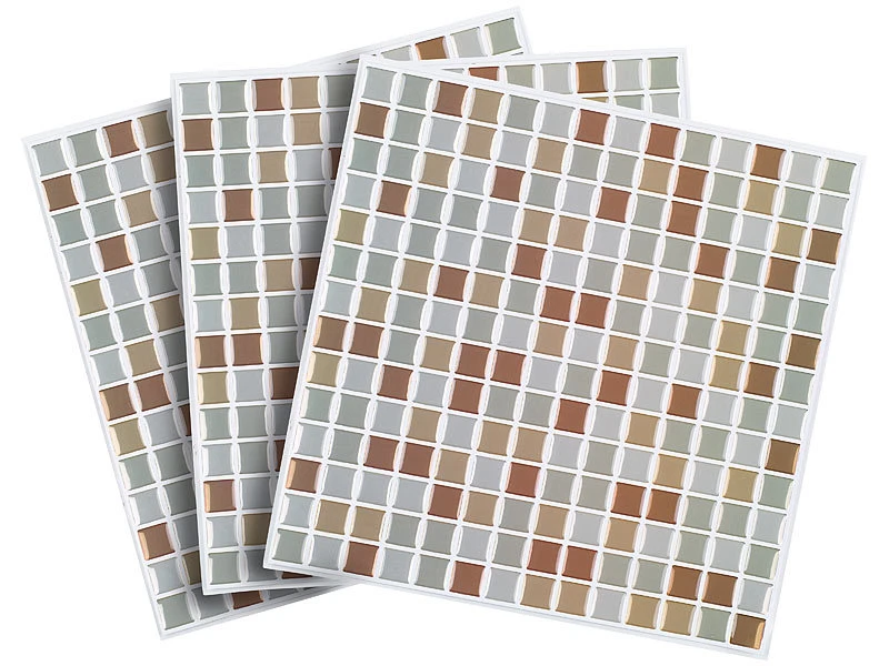 - Set aus 3 Blättern, Maße: je 26 x 26 cm, Maße der einzelnen Mosaik-„Steine“: 15 x 15 mm – Selbstklebende Fliesenfolie 3D – Außerdem relevant oder passend zu: WC, Folie, Kleber, Reparatur, Klebefolie, Reparaturset