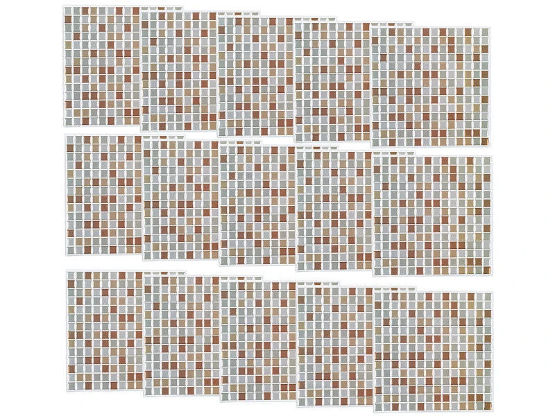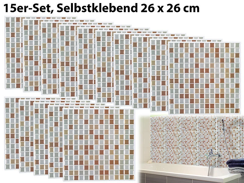 - Set aus 15 Blättern, Maße: je 26 x 26 cm, Maße der einzelnen Mosaik-„Steine“: 15 x 15 mm – Mosaik Fliesen Kunststoff – Außerdem relevant oder passend zu: WC, Vinyl, Folie, Kleber, Reparatur, Klebefolie, Reparaturset