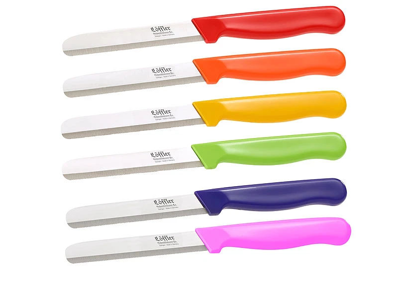 Liegt gut in der Hand: Die bunten Kunststoff-Griffe sind besonders ergonomisch geformt. So halten Sie die Messer immer fest in der Hand und führen es beim Schneiden und Schälen präzise und zielsicher.