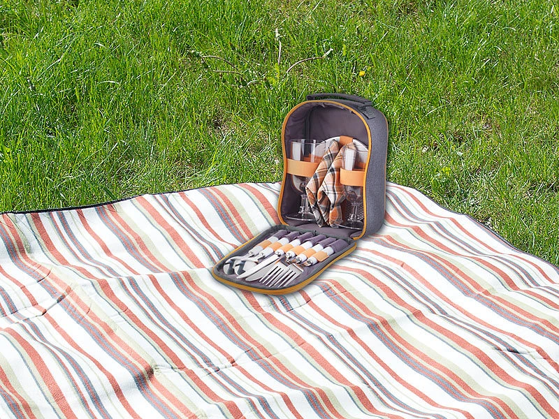 Jetzt haben Sie alles dabei für den nächsten Ausflug ins Grüne! Die handliche Tasche enthält Teller, Besteck, Weingläser und Servietten für 2 Personen. Nur für Getränke und Snacks müssen Sie noch selber sorgen.