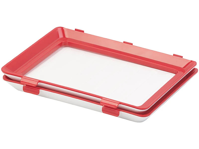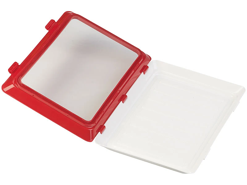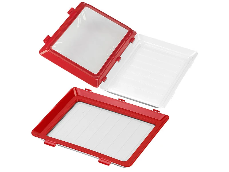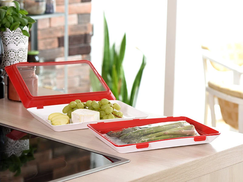 Kinderleichte Verwendung: Legen Sie Ihre Lebensmittel einfach in das Unterteil und klappen Sie den Deckel zu. Der extrem flexible Foliendeckel sorgt dabei für einen nahezu luftdichten Abschluss.