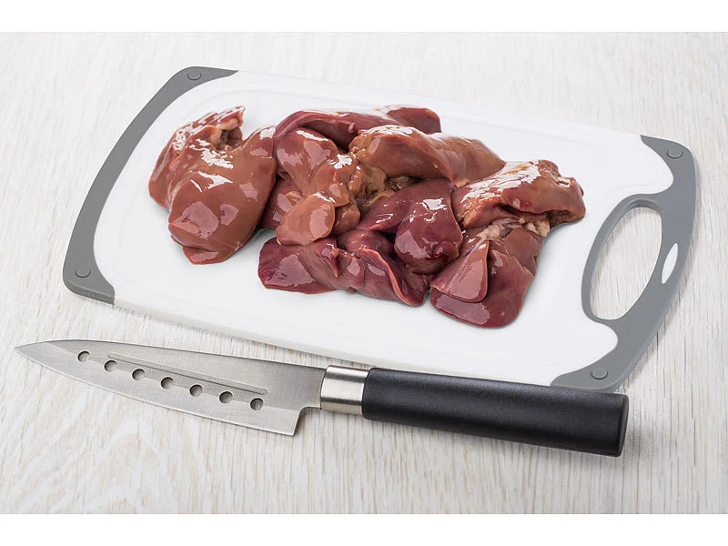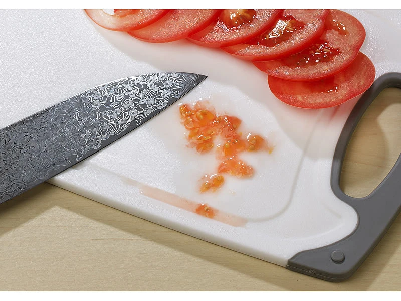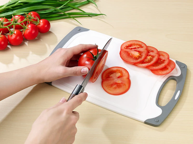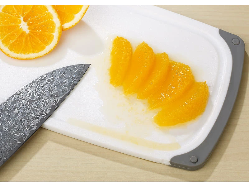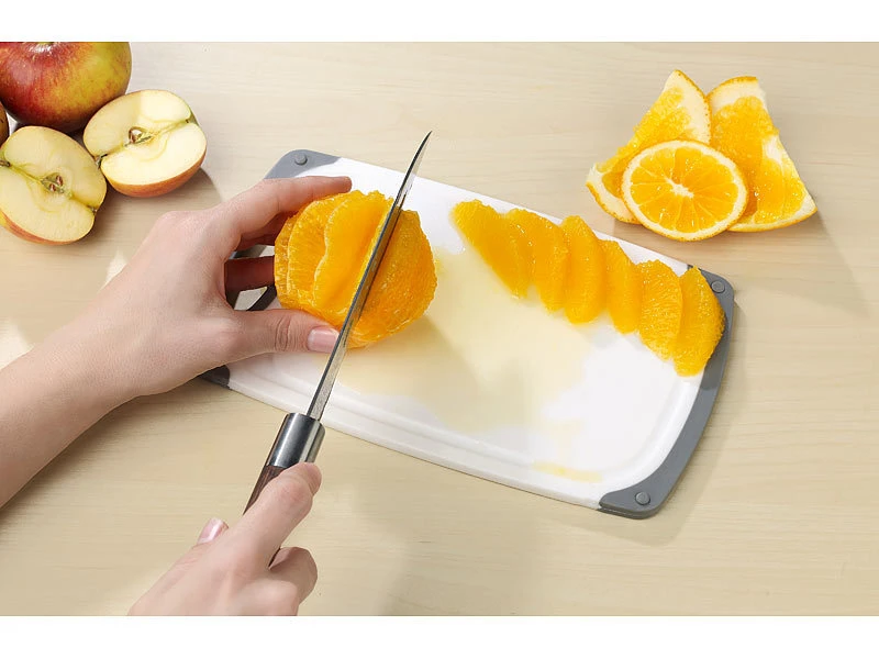Macht sauberes Schnippeln einfach: Die spezielle Kunststoffoberfläche macht es Bakterien und Keimen schwer, sich festzusetzen. Eine umlaufende Saftrille fängt zudem Flüssigkeit oder Krümel auf. So halten Sie auch Ihre Arbeitsfläche oder Ihren Tisch rein. Außerdem rutschen Ihre neuen Bretter beim Schneiden nicht hin und her. Und nach getaner Arbeit reinigen Sie sie bequem und hygienisch in der Spülmaschine.
