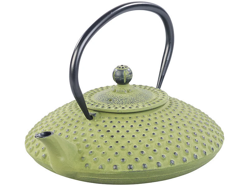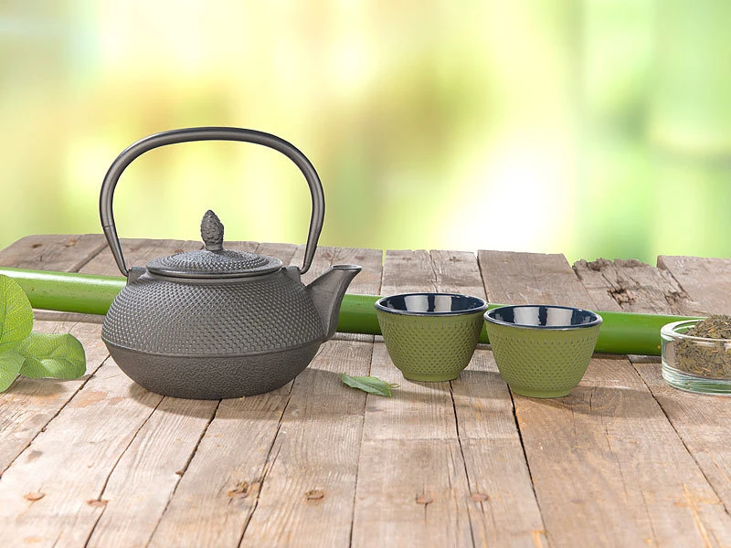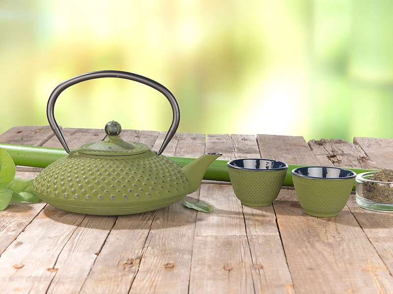Tee wie vom Zeremonien-Meister: Ihr olivgrünes Tee-Set steht ganz in der Tradition eines asiatischen Tetsubin-Teeservices. Holen Sie sich jetzt einen Hauch authentischer Teezubereitung nach Hause, so wie sie in Fernost seit Jahrtausenden praktiziert wird.