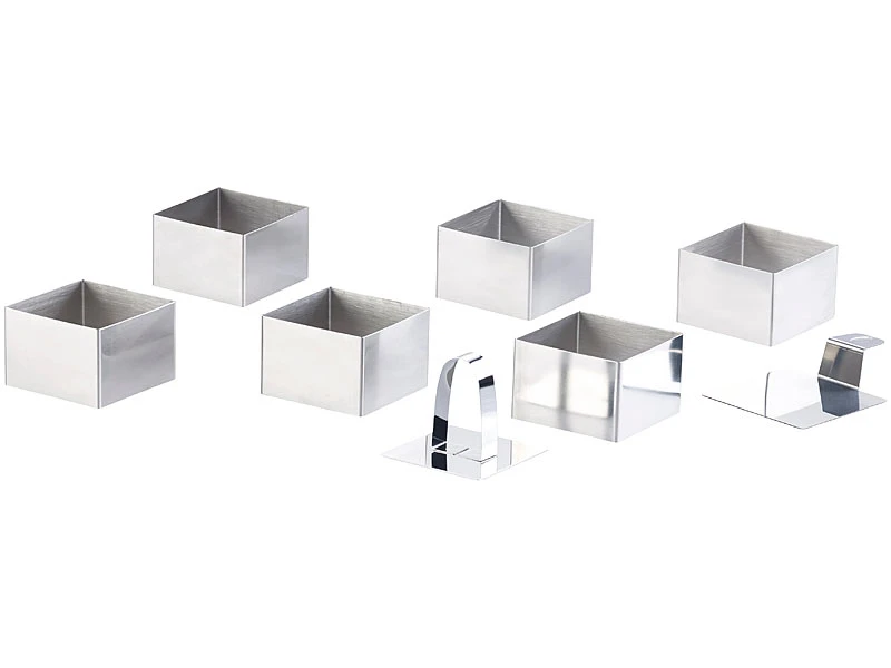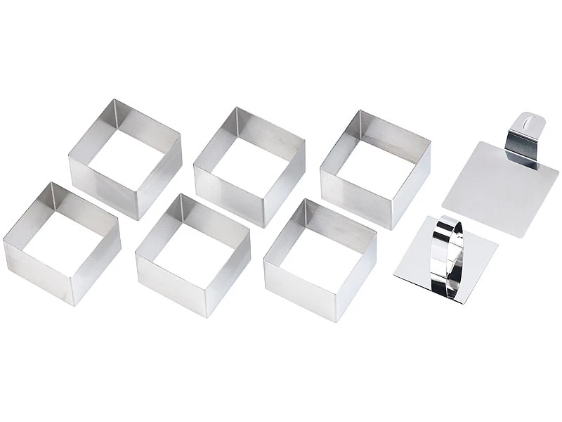 - Komplett-Set: 6 quadratische Dessert-/Speiseringe, 1 Heber, 1 Stampfer
