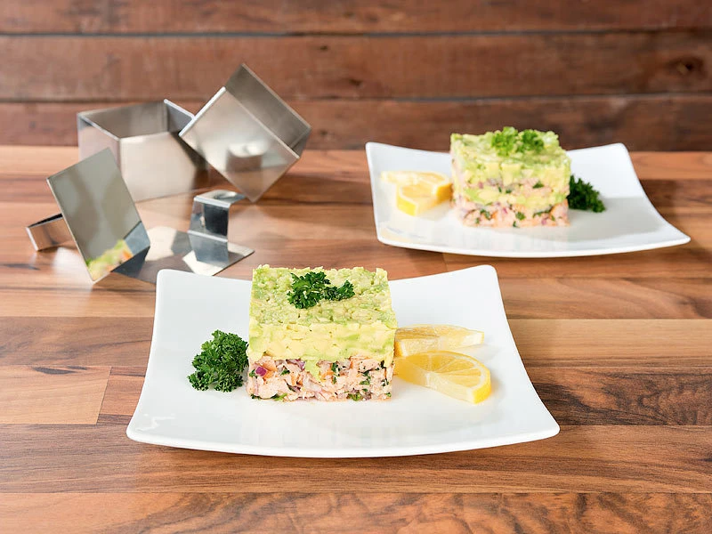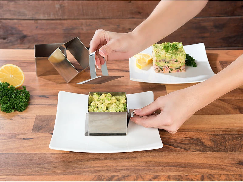 Richten Sie alles professionell an: Erschaffen Sie auch kleine Desserts, Brot oder Gebäck direkt im Speisering. Die hochwertigen Speiseringe sind hitzebeständig und sogar für den Backofen geeignet.