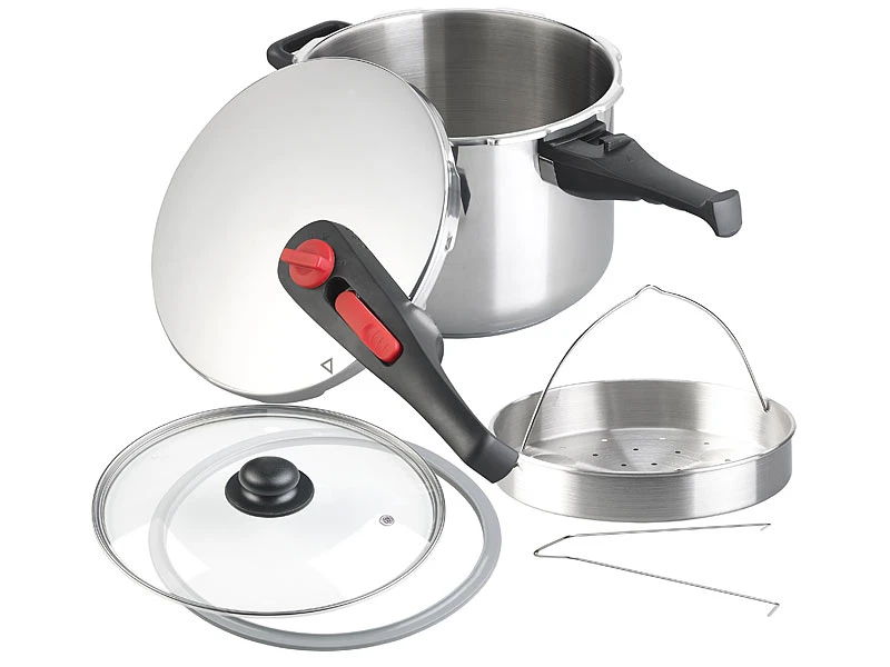 - Schnellkochtopf inklusive Deckel, Dichtungsring, Glas-Deckel mit Silikon-Ring, Sieb-Einsatz, Ständer und deutscher Anleitung