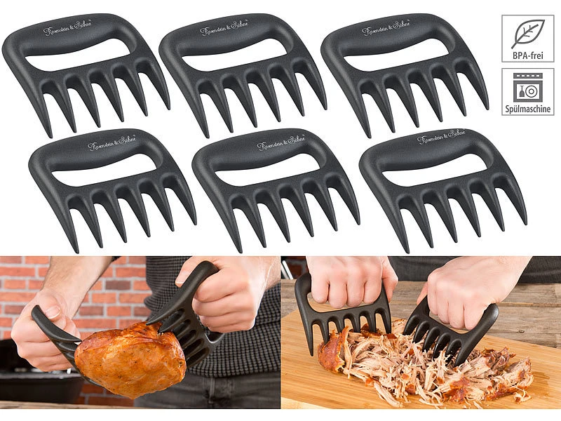 Stilvolles Zerzupfen: Das sanft gegarte Fleisch wird nicht geschnitten, sondern durch Ziehen in kleine Stücke gerissen. Mit diesen robusten Fleisch-Krallen zerteilen Sie es ganz einfach, schonend und schnell.