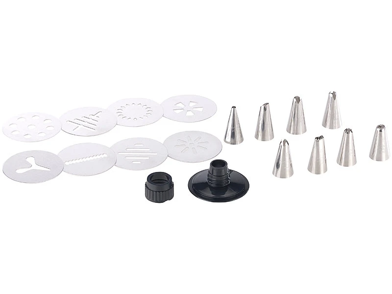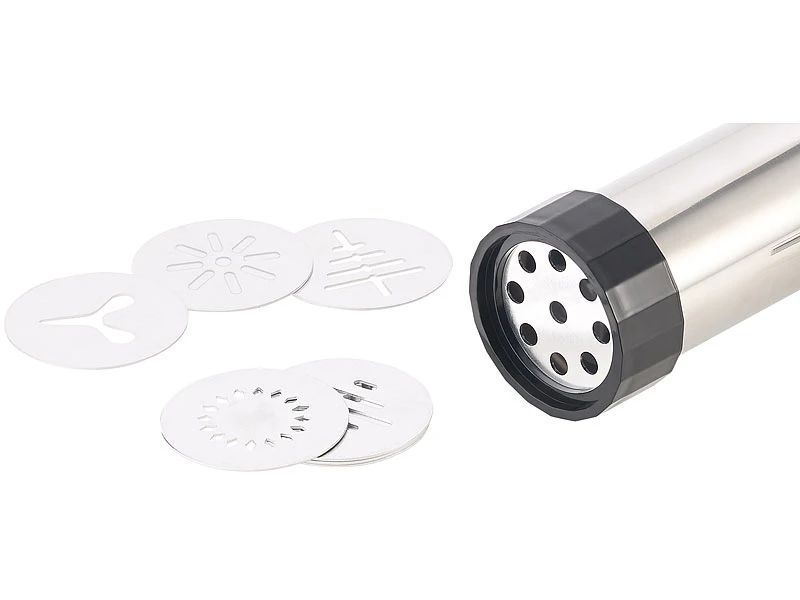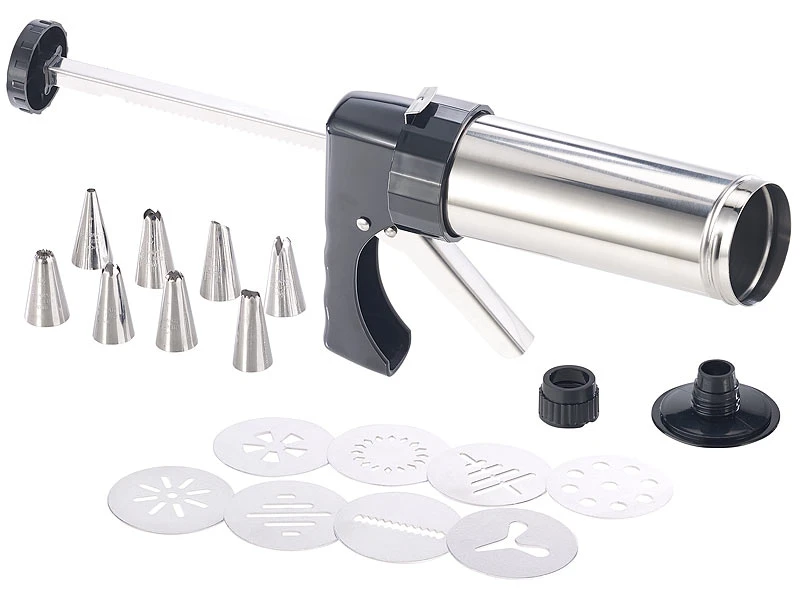- Edelstahl-Gebäckpresse & -Garnierspritze inklusive 8 Schablonen, 8 Spritztüllen und deutscher Anleitung