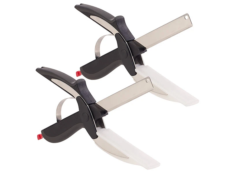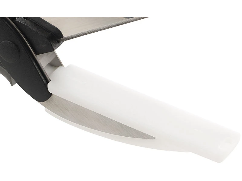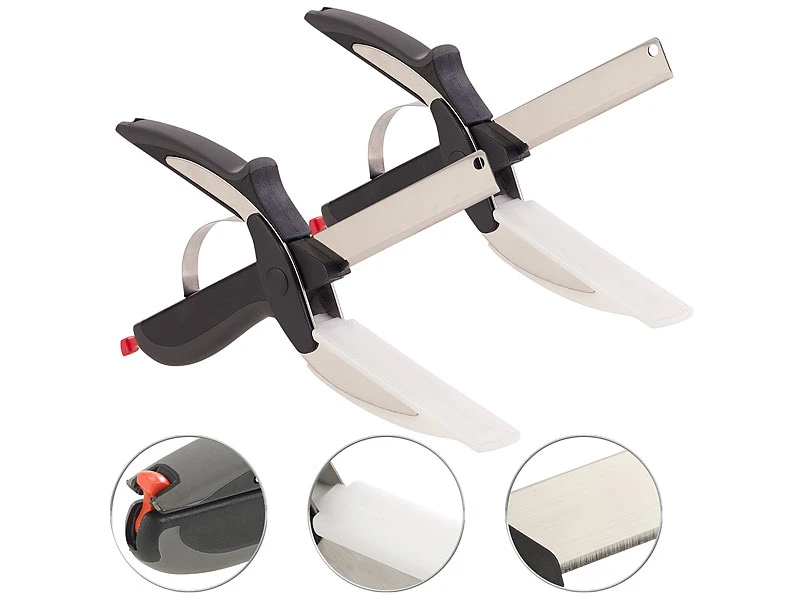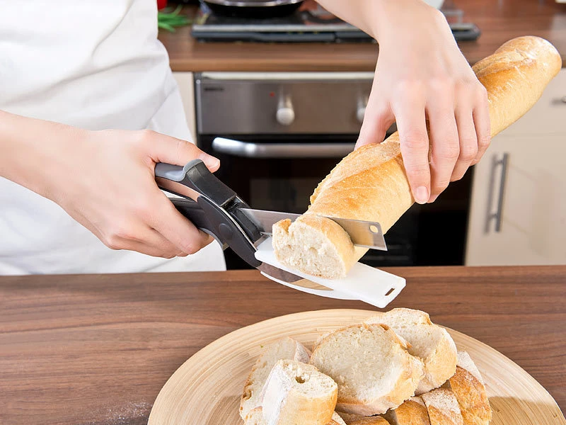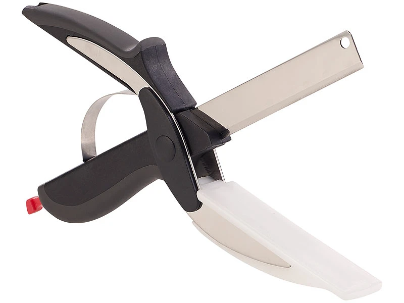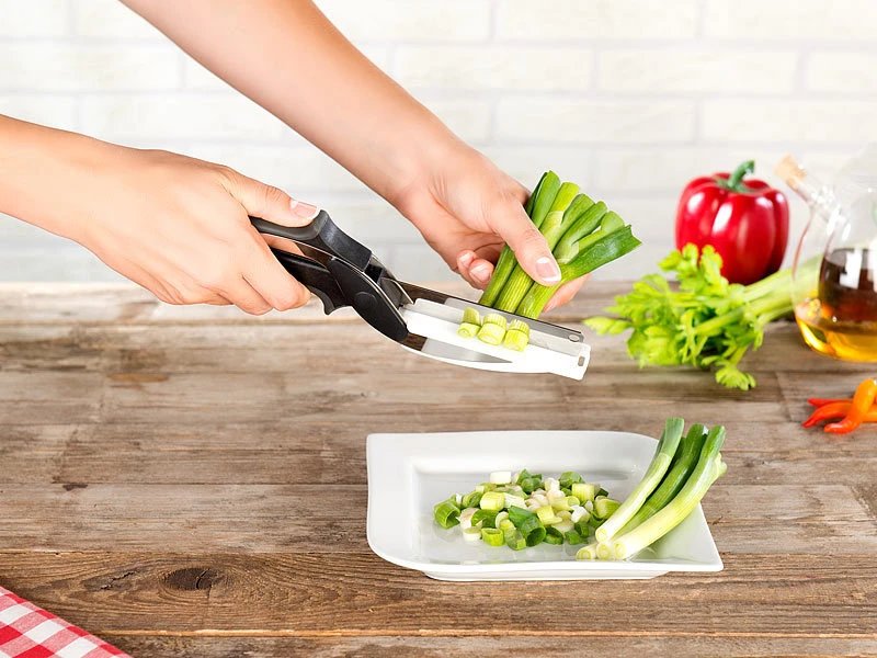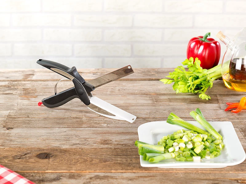 Messer und Schneidebrett in einem: Ihr praktischer Küchenscheider vereint Messer und Schneidebrett in einem Gerät. Wie mit einer Schere zertrennen Sie Ihre Lebensmittel schnell und bequem.