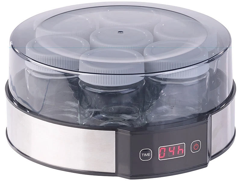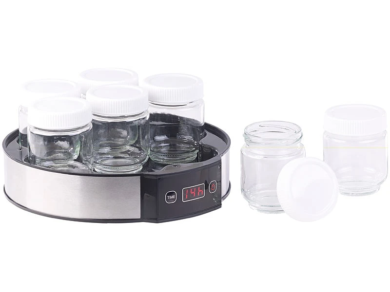 - Maße Joghurt-Maker: 24,8 x 24 x 11,5 cm, Gläser (Ø x H): 8,5 x 6,5 cm, Gewicht: 1,8 kg
