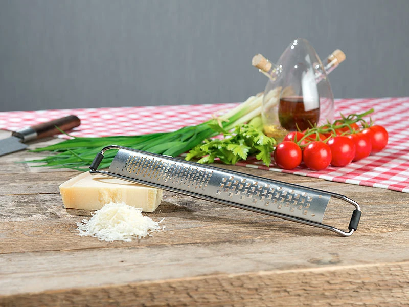 Reiben Sie feste Lebensmittel jetzt mühelos: Dank feiner und mittlerer Reibeflächen bringen Sie Nüsse, Gemüse, Parmesan und Schokolade ganz einfach in Form. Auch auf dem Esstisch machen Ihre neue Edelstahl-Reiben eine gute Figur. Bieten Sie Ihren Gästen Hartkäse am Stück zum Selberreiben an. Frischer geht’s nicht!