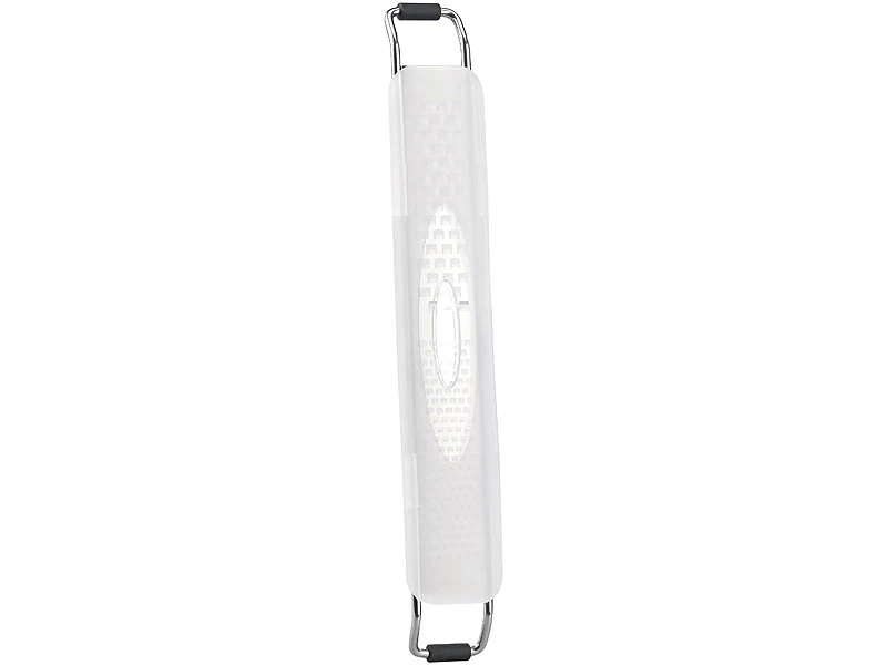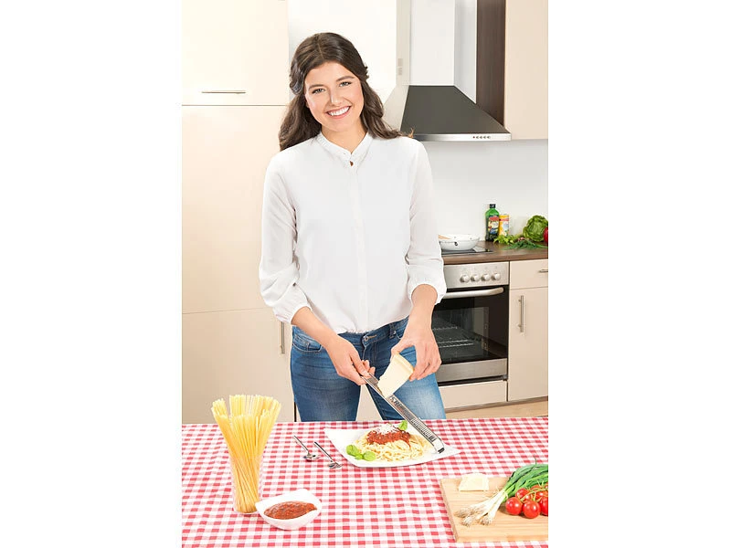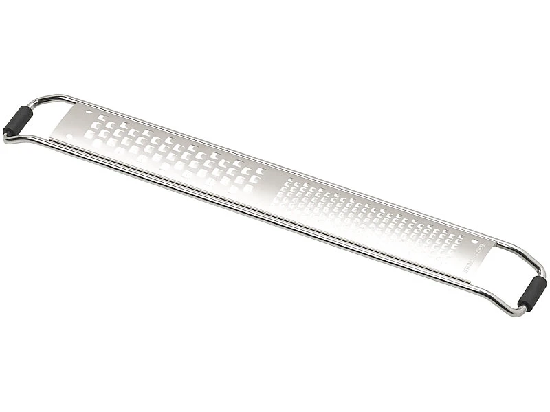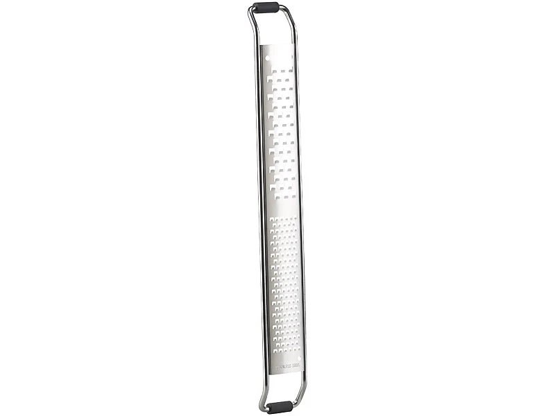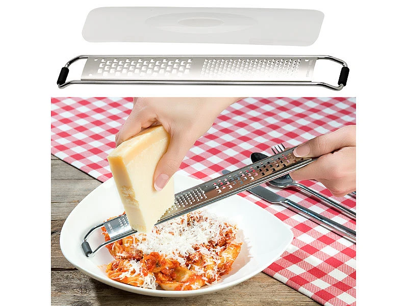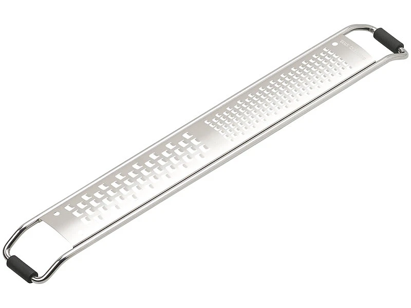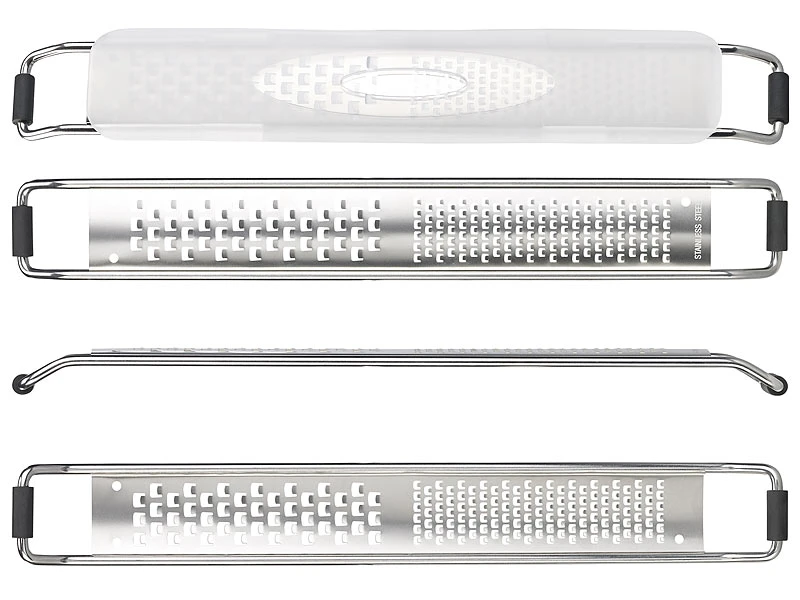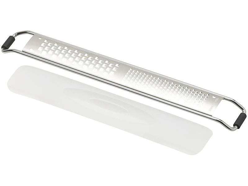 Sicher reiben und geschützt verstauen: Die rutschfesten Gummifüße sorgen für eine sichere Handhabung. Dank des Klingenschutzes und der kompakten Maße bewahren Sie die rostfreien Langreiben zudem bedenkenlos in der Besteckschublade auf.