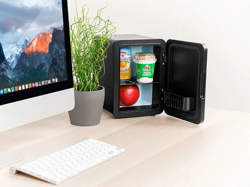 Ganz schön cool und richtig heiß: Jetzt haben Sie immer ein kaltes Getränk in Griffweite – ob beim Camping am See oder im Büro. Oder Sie halten stattdessen Ihre Mahlzeit warm. Ein Peltier-Element kühlt den Innenbereich des Mini-Kühlschranks bis zu 18 °C unter Umgebungstemperatur herunter. Oder heizt ihn auf Wunsch bis auf 60 °C!