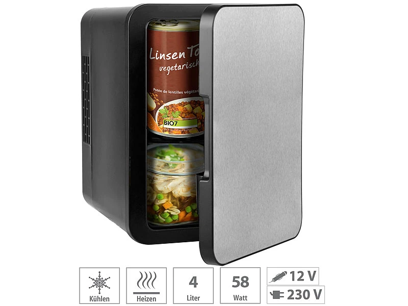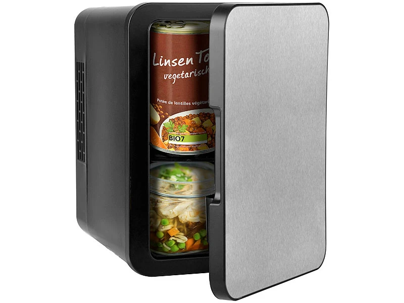 Hochwertiger Look und kompakt: Mit 4 Litern Stauraum finden bis zu 4 Getränkedosen und Snacks Platz. Dazu verleiht die Edelstahlfront dem Mini-Kühler ein cooles, hochwertiges Aussehen.