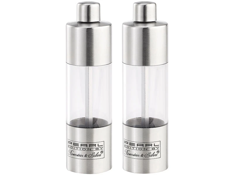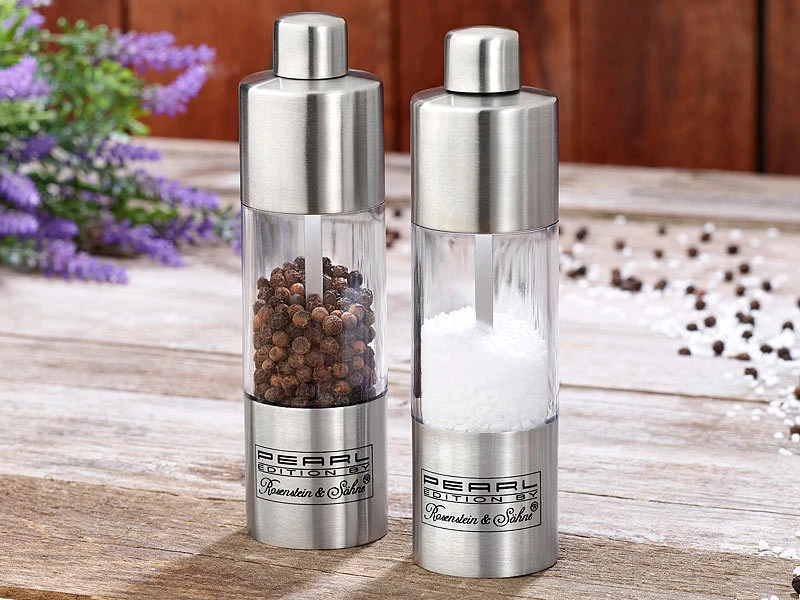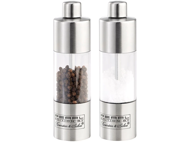 Ihr neues Gewürzmühlen-Set ist praktisches Accessoire und dekorativer Blickfang zugleich. Dank formschöner Gehäuse aus satiniertem Edelstahl passen Salz- und Pfeffermühle zu jedem Geschirr, zu jedem Stil und zu jeder Tischdekoration.
