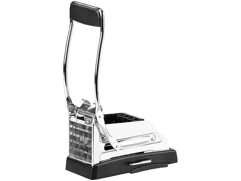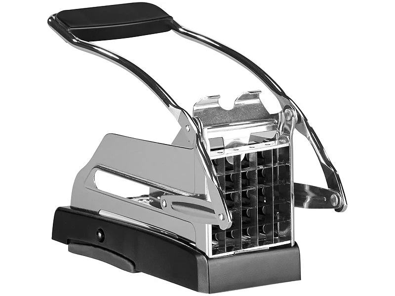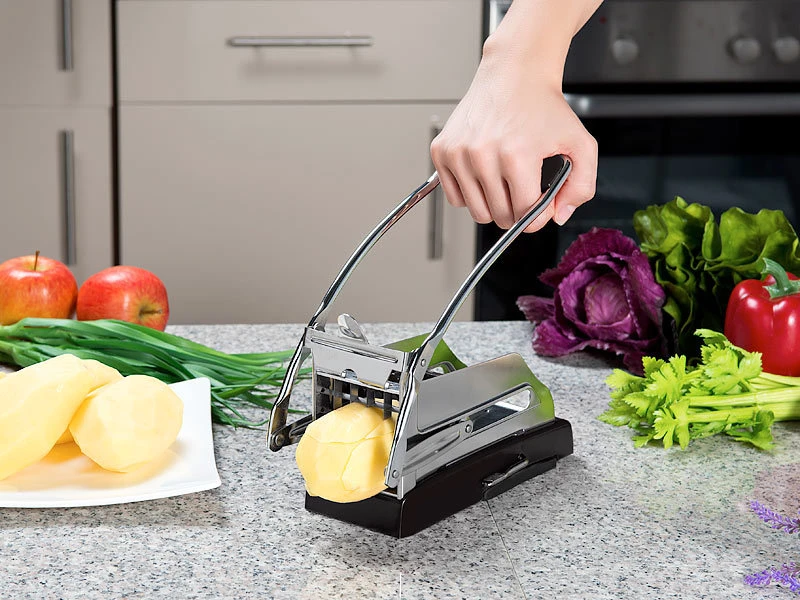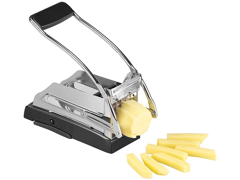 Frische Pommes ganz einfach selbstgemacht: Legen Sie Kartoffeln ein und drücken Sie den großen Hebel runter. Schon haben Sie gleichmäßige Streifen für leckere Fritten! Aber auch Obst und anderes Gemüse schneiden Sie rasch in gleichmäßige Stäbchen.