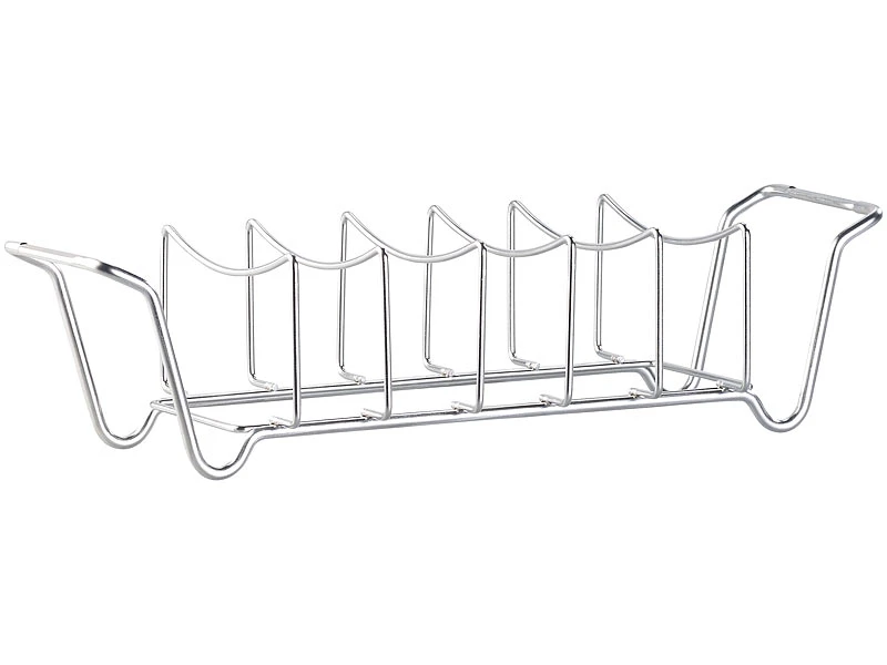 Bereiten Sie bis zu 5 Spareribs gleichzeitig zu: Diese platzieren Sie hochkant im Rippchenhalter. Auf diese Art verbrauchen sie viel weniger Platz auf dem Grill. Alternativ grillen Sie auch ganze Braten auf dem Gestell.