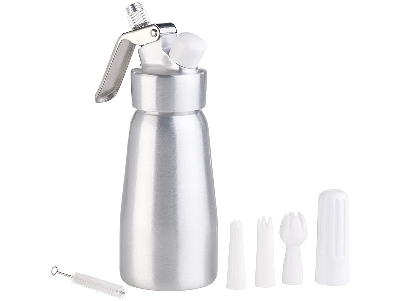 - Sahnesiphon inklusive Tüllen, Reinigungs-Bürstchen, Gaskapsel-Halter, Verschlusskappe und deutscher Anleitung – Siphon – Außerdem relevant oder passend zu: Backen, Edelstahl, Handmixer, Sahnekapsel, Sahnekapseln, Kapselhalter, Gaskartusche