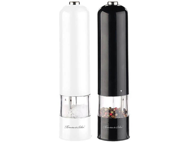 - 2er-Set elektrische Gewürzmühlen inklusive je 1 Deckel und deutscher Anleitung – Pfeffer und Salzmühle – Außerdem relevant oder passend zu: Gewürz, Kochen, Drücker, Elektrischer