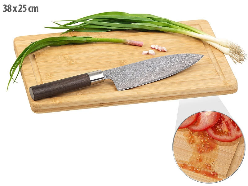 Ein Muss für jede Küche: Die robusten Schneidebretter aus Bambus ist perfekt geeignet um Obst, Gemüse und saftiges Fleisch zu schneiden. Eine umlaufende Saftrille fängt zudem Flüssigkeit oder Krümel auf. So halten Sie auch Ihre Arbeitsfläche oder Ihren Tisch rein.