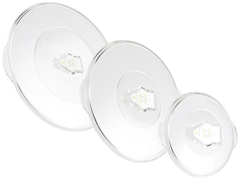 Super flexibel: Mit diesen 3 praktischen Vakuum-Universaldeckeln haben Sie für nahezu jeden runden Behälter mit glattem Rand und einem Durchmesser von 7,5 bis 24 cm den passenden Deckel zur Hand. Verschließen Sie Schüssel, Topf, Pfanne & Co. luftdicht.