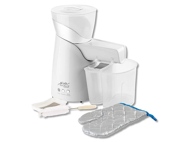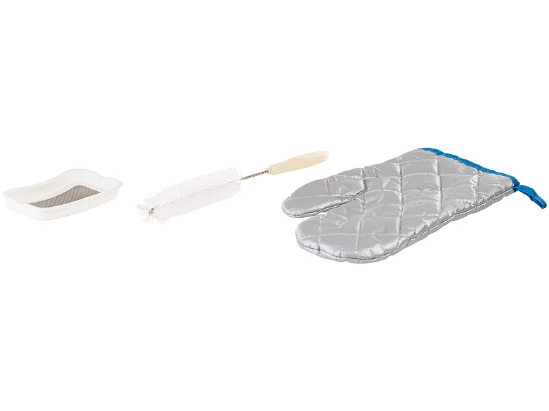 - Zubehörteile: Trichter mit Deckel, Ölauffang-Behälter, Auffang-Behälter für Rückstände, Sieb, Reinigungs-Bürste, Hitzeschutz-Handschuh