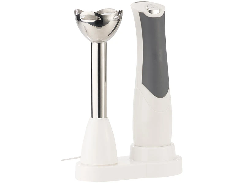 - Edelstahl-Akku-Stabmixer inklusive 2 Aufsätzen mit Verbindungsstücken, Mixbecher, Ladestation, Netzteil und deutscher Anleitung – Akku Küchengeräte – Außerdem relevant oder passend zu: Mini, Besen, Muffin, selbst, Kochen, Backen, Blender, Häcksler, Smoothie, Standmixer, Kabelloser, Messer Set, Zauberstab, Elektrische, Küchengeräte, Milchaufschäumer