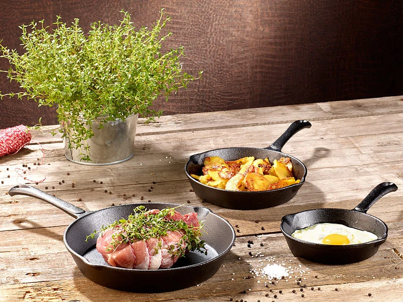 - Pfannen aus robustem Gusseisen, im 3er-Set