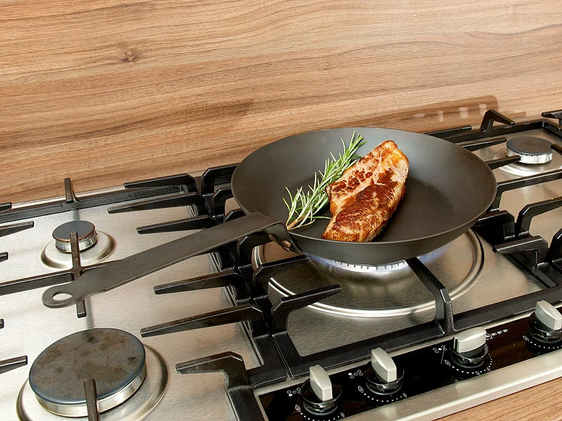 Robust und für alle Herdarten: Die Pfannen sind unbeschichtet und somit kratzfest. Sie sind geeignet für Elektro-, Gas- und Induktionsherde, für die Bratröhre und sogar für offenes Feuer.